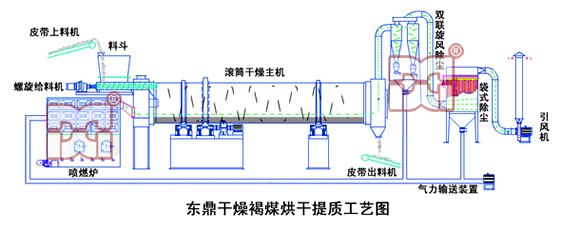 成功克服褐煤干燥過程中的粉塵污染、安全系數等技術難點東鼎研發的大型褐煤烘干機裝備在煤礦、化工、電力行業推廣應用。整個褐煤烘干機系統主要裝置:煤粉料倉、煤粉噴燃爐、回轉滾筒、旋風除塵器、袋式除塵器、引風機、氣流輸送系統等,工藝流程如圖所示。